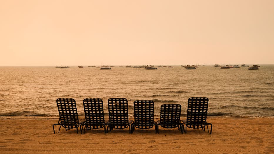 An empty beach near Highway 50 with sky obscured by wildfire smoke due to the Caldor Fire in South Lake Tahoe, California, U.S., on Tuesday, Aug. 31, 2021. California's Caldor Fire moved closer to a popular alpine tourist destination in Northern Cali