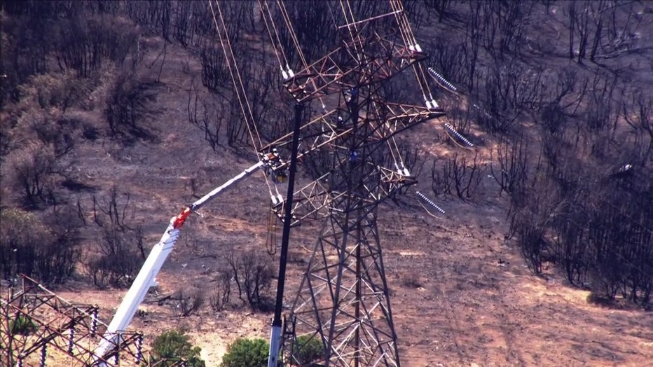 From SkyFOX, crews with Pacific Gas and Electric Co. are seen making repairs equipment on a high voltage transmission tower on Friday, November 1. On Wednesday, October 23, the San Francisco-based utility filed an incident report with the California Public Utilities Commission saying they became aware that there was an equipment failure on the transmission line near where the Kincade Fire started.