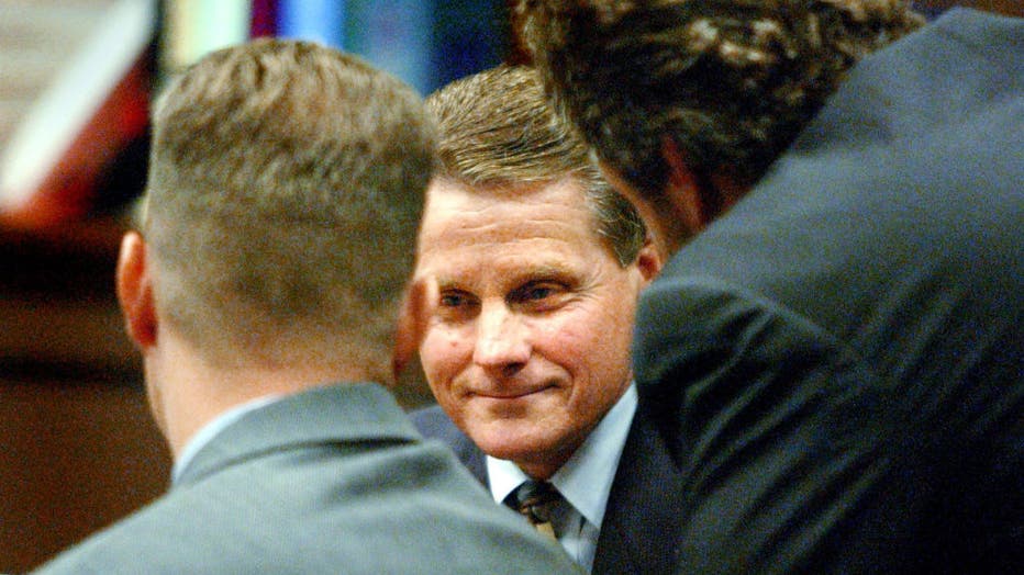 Defense attorney Michael Rains, center, exchanges an optimistic smile with former Oakland Police officer Matthew Hornung, left, as they wait for the verdict at the Alameda County Court House in Oakland, Calif. Sep. 30, 2003. (Ray Chavez/MediaNews Gro