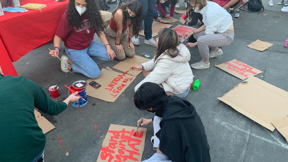 Protesters make signs ahead of former Vice President Mike Pence's speech at Stanford University. February 17, 2022.