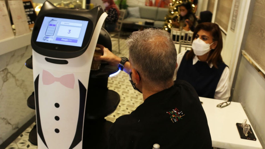FILE - Robot waiters serve customers at Rasa Koffie, Pasar Baru, Jakarta, on Jan. 14, 2022. (Photo by Dasril Roszandi/Anadolu Agency via Getty Images)