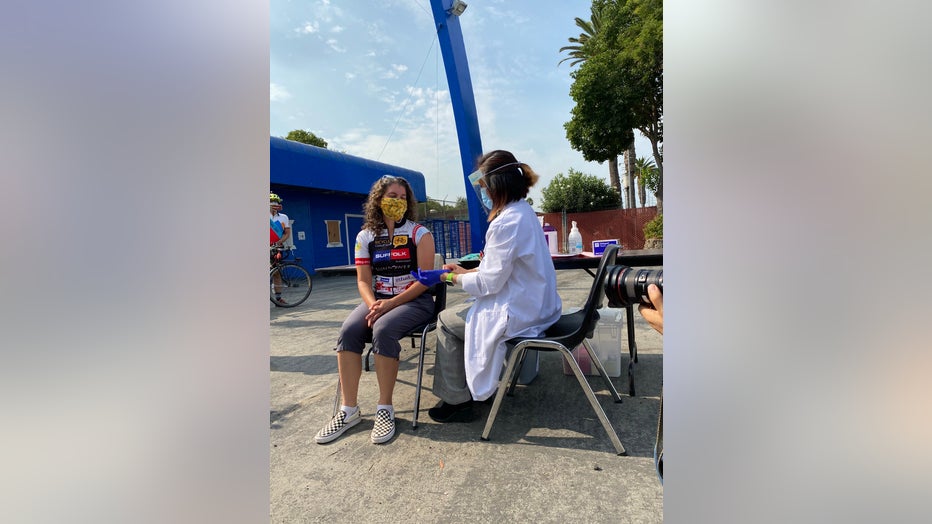 Shiloh Ballard, the Silicon Valley Bicycle Coalition's executive director, gets her flu shot at the Santa Clara County Fairgrounds, where residents can get theirs starting Saturday. (JANA KADAH/BCN FOUNDATION)