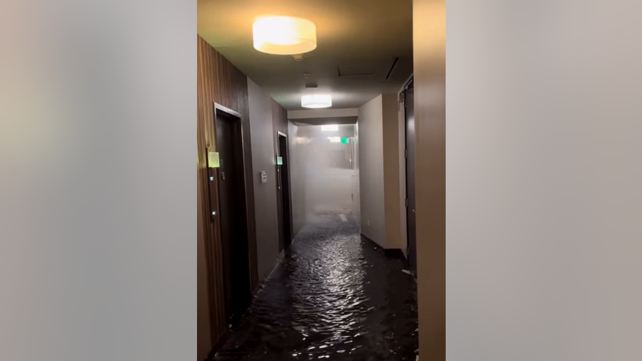 Water floods into the hallway of the 11th floor at 100 Van Ness in San Francisco.