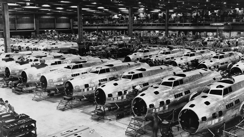 Rows of B-17 Flying Fortress heavy bombers are under production at a Boeing plant in Seattle, Washington. 1942-1945. (Photo by Library of Congress/Corbis/VCG via Getty Images)
