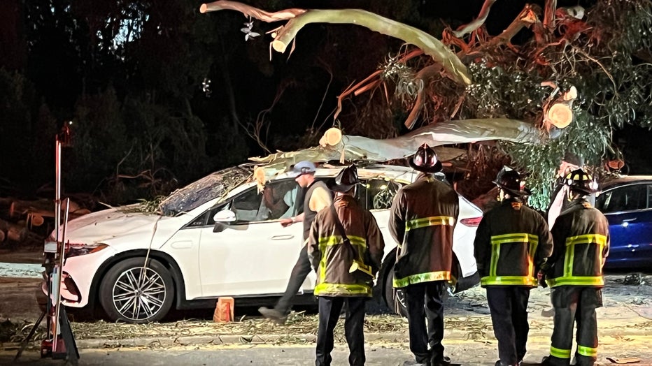 Sandy Yeung and her family saw the tree coming down right on top of their Tesla. "I was in the car with my family and next thing you knew is this big tree with the lamppost came down in slow motion on us." She said they had a good vantage point because of the vehicle's glass roof.