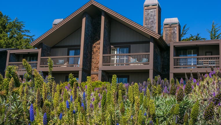 BODEGA BAY, CA - APRIL 23: The Bodega Bay Lodge and surrounding homes, perched above Sonoma County's Doran Regional Park beach, is viewed on April 23, 2014, in Bodega Bay, California. Warm sunny skies in Sonoma County Wine Country have turned springt
