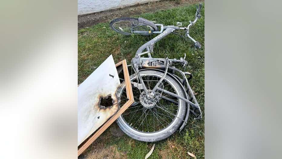 An electric bike's battery sparked the fire, as seen in this photo from the scene.