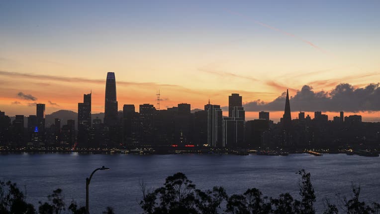 SAN FRANCISCO, CALIFORNIA - DECEMBER 29: A view of San Francisco-Oakland Bay Bridge and buildings during sunset as seen from Treasure Island in San Francisco, California, United States on December 29, 2024. (Photo by Tayfun Coskun /Anadolu via Getty