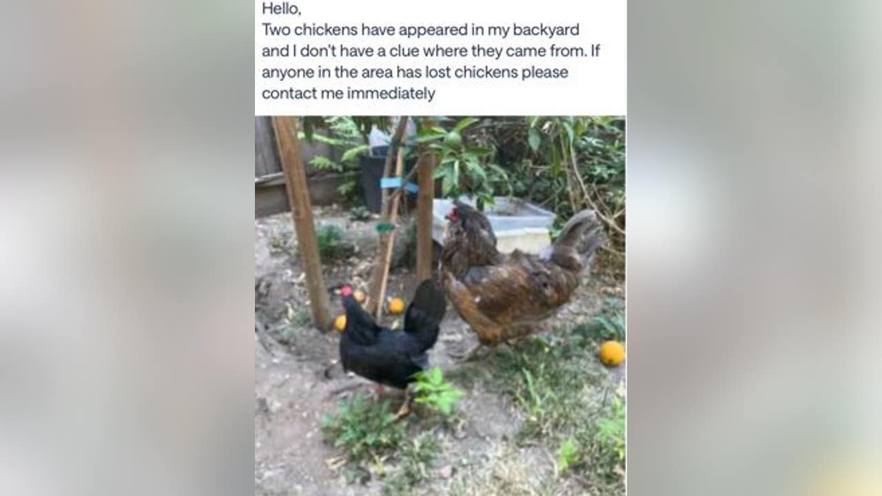 A woman in the San Jose area posted to Nextdoor: "Hello, two chickens have appeared in my backyard and I don't have a clue where they came from. If anyone in the area has lost chickens, please contact me immediately."