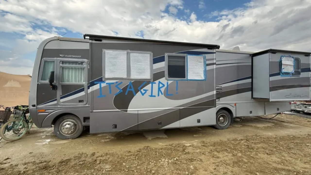 The message, "It's a Girl," was taped onto the RV where Kayla Thompson gave birth to a baby girl at Burning Man on Wednesday, Aug. 27, 2025. (Help support Burning Man Baby Girl 2025 GoFundMe / Lacey Paxman)