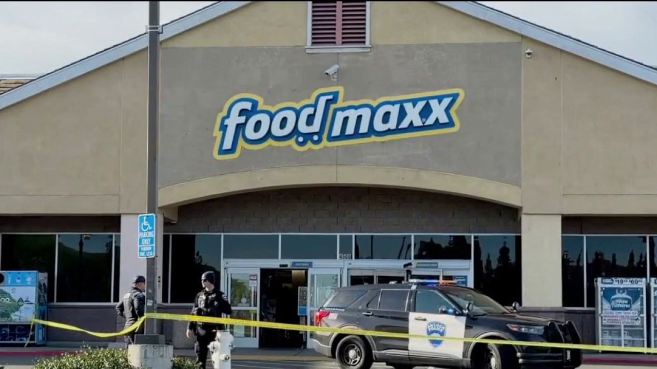 Footage from the scene showed yellow police tape outside a FoodMaxx grocery store, with visible damage to the front of the building. It was not immediately clear where the alleged robbery occurred.