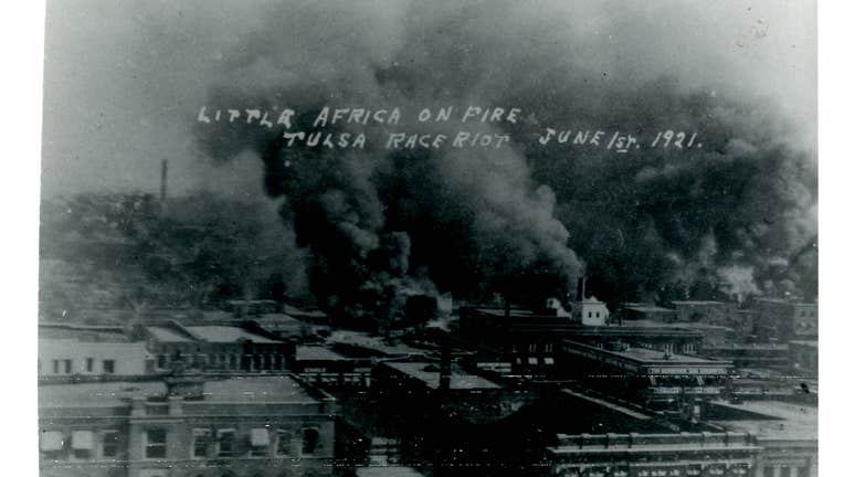 Buildings in the Greenwood District burning with smoke-filled sky as viewed towards the west from Frankfort and Hartford streets from the Tulsa Race Riot, 1921. Inscribed on the front: "Little Africa on fire, Tulsa Race Riot, June 1st, 1921." (Courte