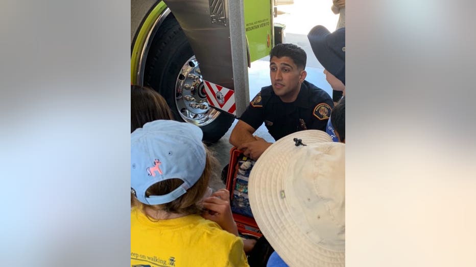 Fire Engineer Paramedic Gabriel Shamiya talking with kids at a Mountain View fire station. (City of Mountain View Fire Department)