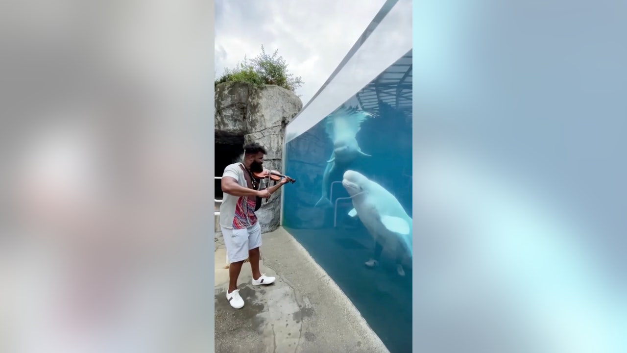 In a video shared on Instagram by the aquarium, the violinist — Big Lux — treats Juno, Kela and Natasha the whales to a musical performance. The three whales move their fins and swim around to the classical tunes.