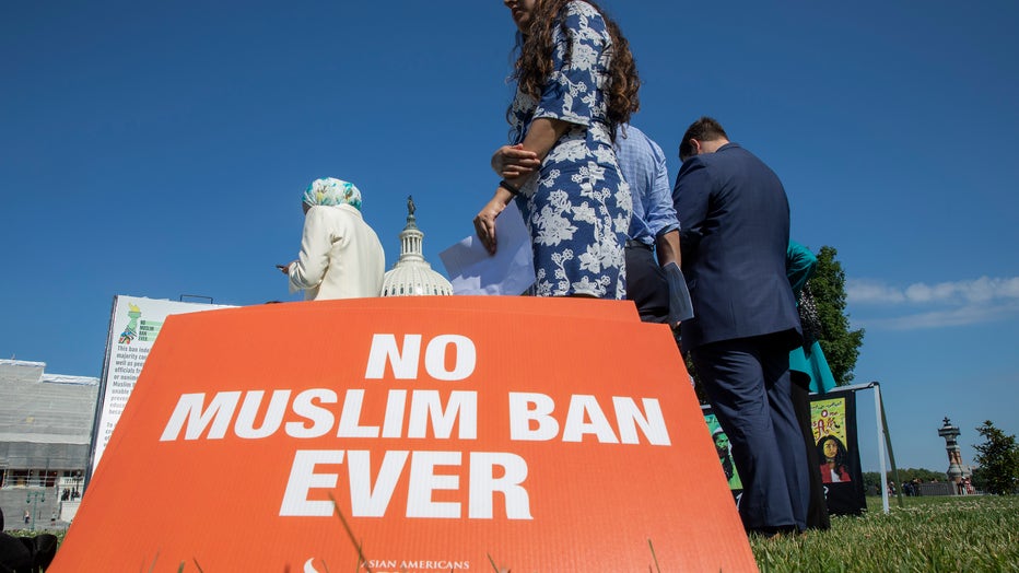 Activists protest on the anniversary of the Supreme Court's ruling upholding the Trump administration's restriction of travel to the U.S. from predominantly Muslin countries, on Capitol Hill June 26, 2019 in Washington, DC. The Court in a 5-4 ruling