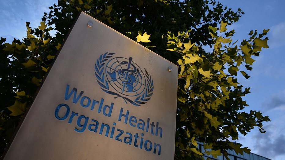 A photo taken in the late hours of August 17, 2020 shows a sign of the World Health Organization (WHO) at their headquarters in Geneva amid the COVID-19 outbreak, caused by the novel coronavirus. (Photo by Fabrice COFFRINI / AFP) (Photo by FABRICE CO