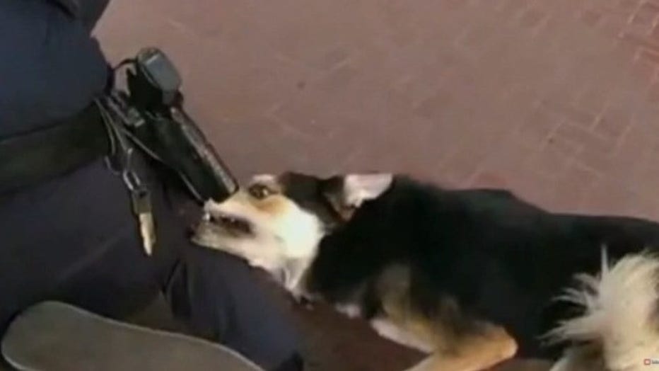 An unleashed dog sinks its teeth into an SFPD officer after it was shot by police. Image courtesy SFPD body-worn camera footage during suspect's arrest.
