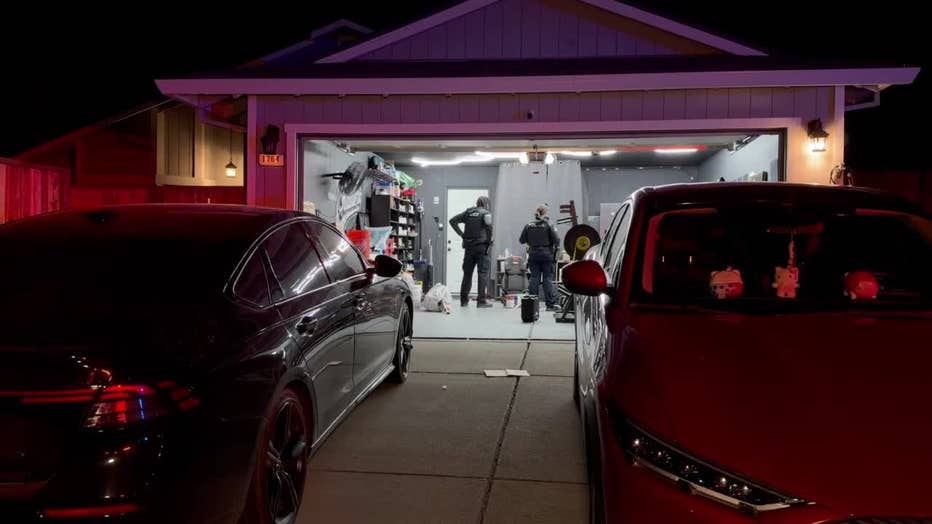 Evidence markers were visible across the floor of a garage at the home where the shooting occurred. Police were seen conducting an investigation inside the structure late Sunday.