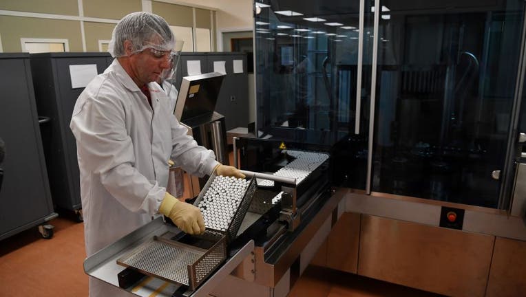 WREXHAM, WALES - NOVEMBER 30: Workers perform last minute quality testing of the 'fill and finish' stage of the manufacturing process of COVID-19 vaccines, during a visit by UK Prime Minister Boris Johnson to Wockhardt's pharmaceutical manufacturing