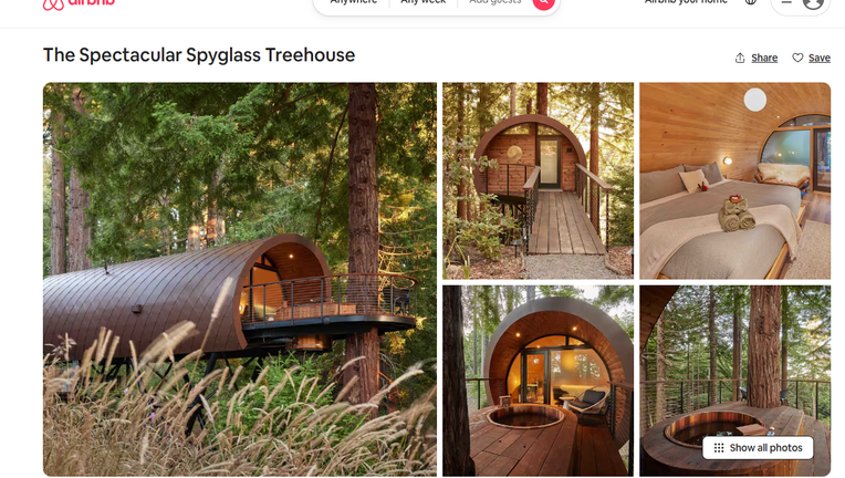The listing is the "Spectacular Spyglass Treehouse" in Occidental, a one-bedroom "magical" getaway in the redwood forest that features an infrared sauna and cedar hot tub and costs about $850 a night with tax.