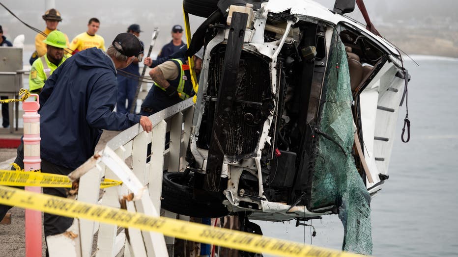 Authorities enlisted the help of a heavy-duty tow truck to lift the vehicle – a white Toyota Sienna minivan – from the ocean. Images taken while the minivan was being lifted showed heavy damage to the vehicle's front end and roof, with airbags deployed and the windshield and several side windows shattered.