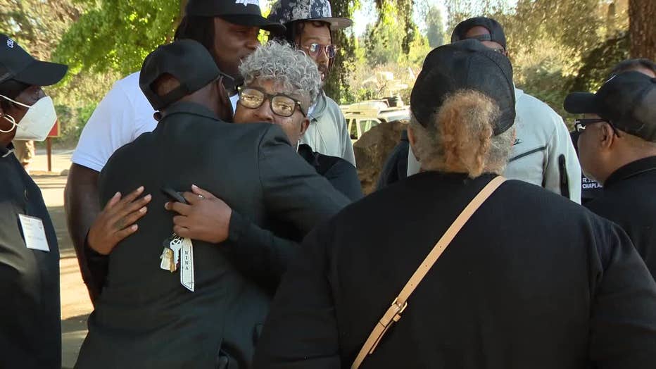 People hug after six people were shot at an East Oakland school complex. Sept. 28, 2022