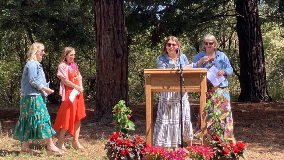 Friends Liz Hadley (far left), Nichole Anderson (far right), and Fabiola Coy at the podium with Leslie Millstone (right) at Laura Zellmer's celebration of life on Saturday, Sept. 13, 2025 in Moraga, Calif. (Amy Janes)