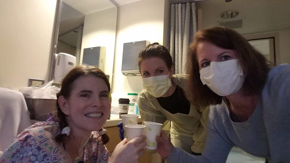 Laura Zellmer (left) with her sisters Kate Cryan (middle) and Joanna Cryan Aiken at UCSF in November 2018. (Joanna Cryan Aiken and Kate Aiken)
