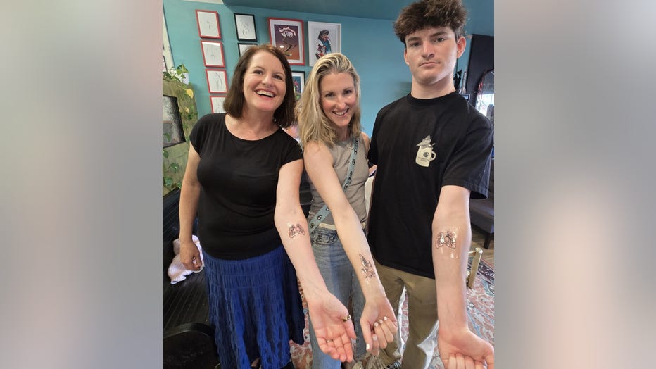 Joanna Cryan Aiken (left), Kate Cryan (middle), and Everett Zellmer got tattoos to honor Laura Zellmer for her son's 18th birthday. (Kevin Zellmer)