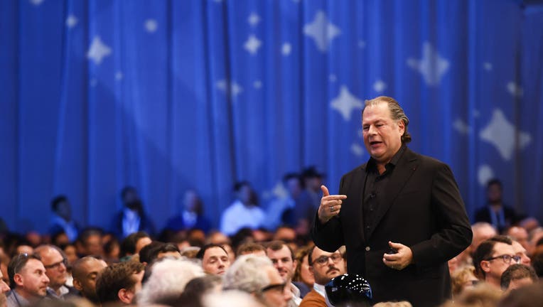 Salesforce CEO Marc Benioff delivers the keynote address at the start of the Dreamforce conference at the Moscone Center in San Francisco, California Tuesday, Oct. 14, 2025. (Photo by Jessica Christian/San Francisco Chronicle via Getty Images)
