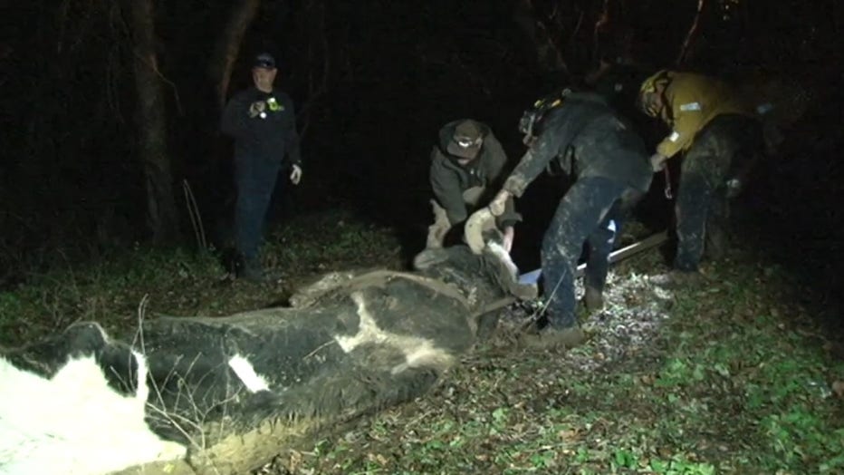 Ultimately, the team used harnesses around Bob's front legs, some rope, a pulley and a tarp to slowly pull his big body up the hill, as colleagues with flashlights beamed light into the darkness to aid the rescue.