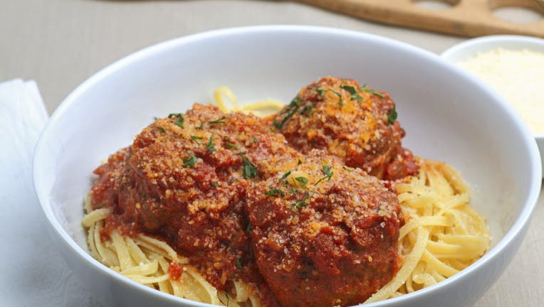 White ceramic bowl with linguini and meatballs covered in red sauce with napkin and pasta mixing tool in background (Photo by Andy Katz/Corbis via Getty Images)