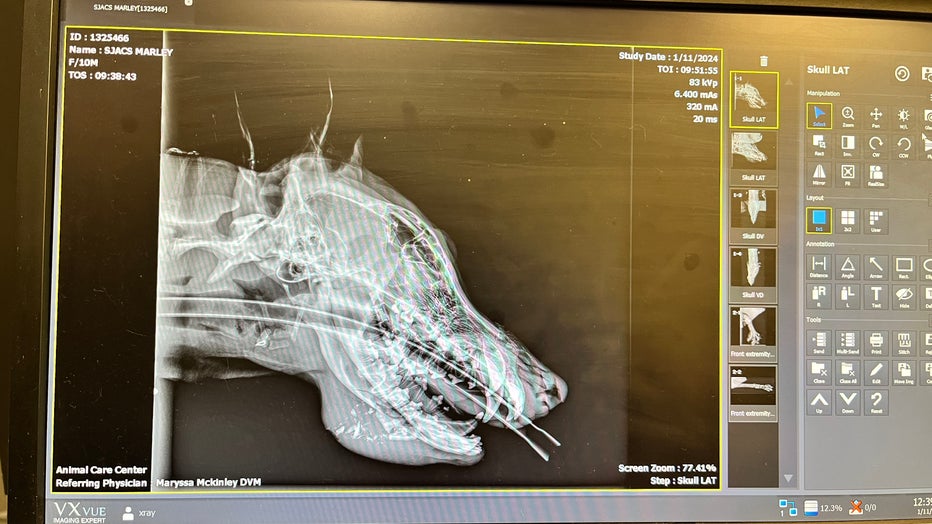 An X-Ray of Marley the dog, who was shot in the skull. Photo: SJPD