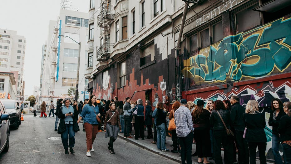 Lines form outside the Regency Ballroom in San Francisco for Pub Choir on Monday, April 27, 2026.