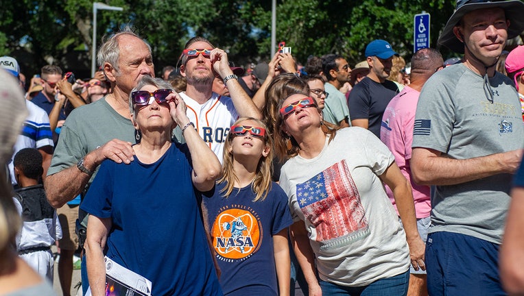 File: People gather to view an eclipse during the Space Center Houston Annular Eclipse Celebration and viewing event at NASAs John Space Center Saturday, Oct. 14, 2023. (Kirk Sides/Houston Chronicle via Getty Images)