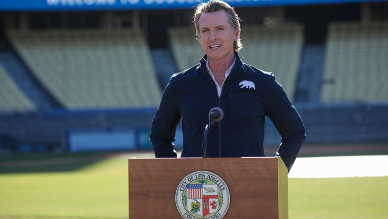 LOS ANGELES, CA - JANUARY 15: Governor Gavin Newsom addresses a press conference held at the launch of mass COVID-19 vaccination site at Dodger Stadium on January 15, 2021 in Los Angeles, California. (Photo by Irfan Khan/Los Angeles Times via Getty I