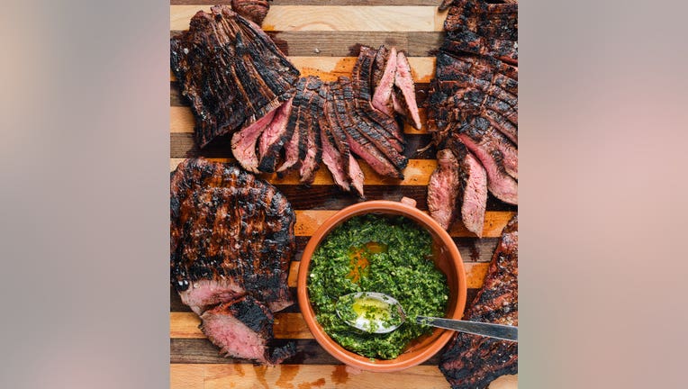 Let me tell you a bit about my in-laws. My mother-in-law is the queen of marinades . . . she marinates everything! Just like her, I love a good marinade, but unlike her, I love some spicy heat in mine. Now, about my father-in-law. Flank steak is his favorite thing to cook, especially on the grill, but when his daughter married a chef, he started questioning his grilling skills. Michael, trust me: You are a fabulous grill master (now it’s in writing)—I’m here to tell you that if you know how to do something well, never question it! Here’s my stick-to-what-I-know spin on my mother-in-law’s marinade, and I hope you love it. If you prefer a spicier flavor, add more jalapeños. By the way, the "zippy sauce" I serve on the side can go on everything. (Maybe not on ice cream—but prove me wrong!) It’s also a great vegan option to add interest to any side dish. It goes beautifully on tofu, eggplant, or quinoa, and I’m sure you’ll find even more killer combos for its use.
