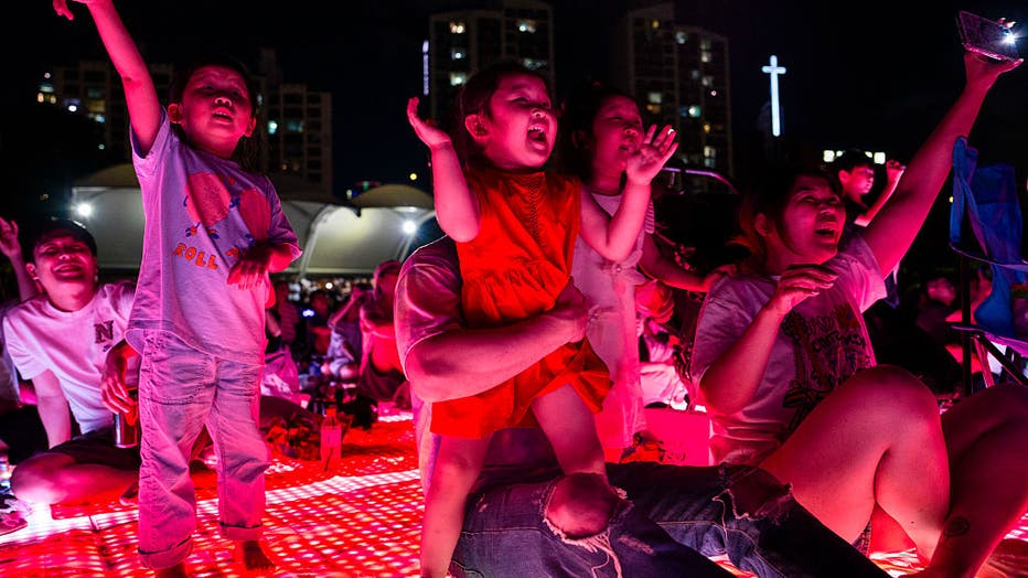 Lee Yeon-woo, 5; and sisters Kim Seo-a, 4, and Kim A-rin, 5, cheer as they watch a drone show themed after the Netflix movie "KPop Demon Hunters" with their parents (Photo by Jintak Han/The Washington Post via Getty Images)