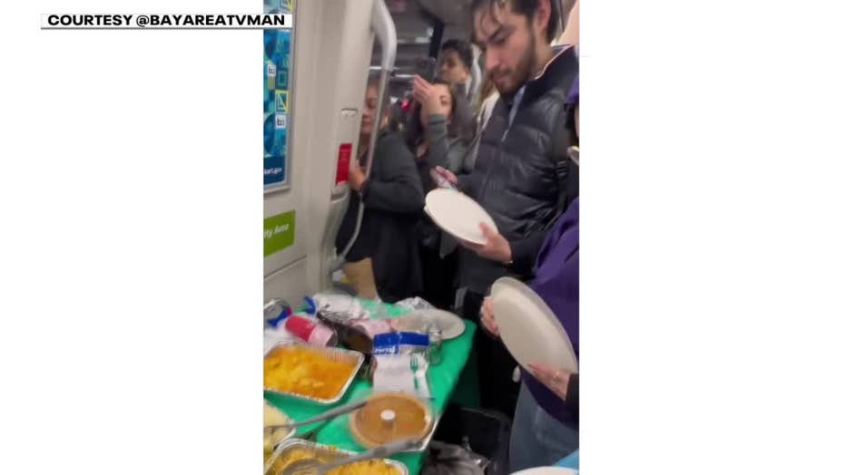 OAKLAND, Calif. - BART riders did double takes Thursday morning when a full Thanksgiving feast appeared inside a train car, complete with a table, decorations and holiday dishes.