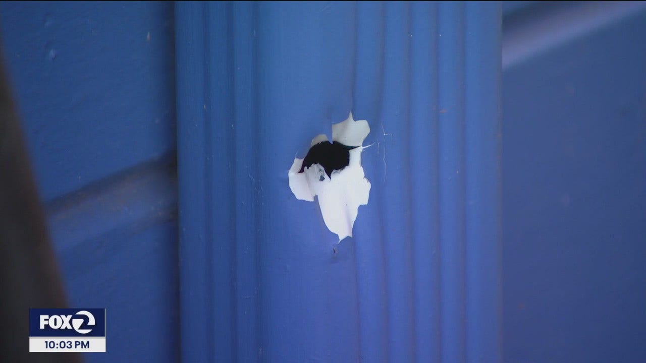 The parents showed KTVU bullet holes they said were left by shots fired by the teenager or the person he was with. One bullet struck the front of the home, another in the drain pipe on the side of the house, a third in a tire stack in their front yard, and a fourth hit the back of a family member's vehicle.