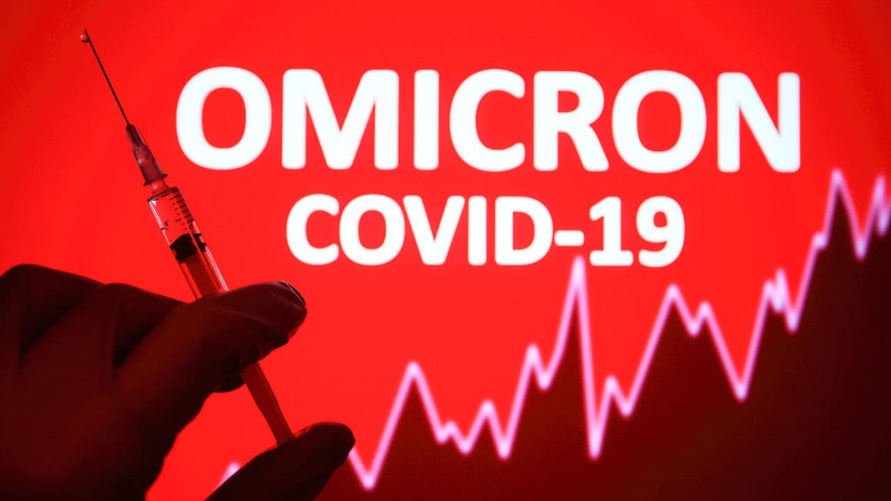 In this photo illustration, a hand holding a medical syringe is seen in front of the words Omicron COVID-19 with a red graph line chart. Omicron (B.1.1.529), a new SARS-CoV-2 variant of concern continues to spread worldwide. (Photo Illustration by Pa