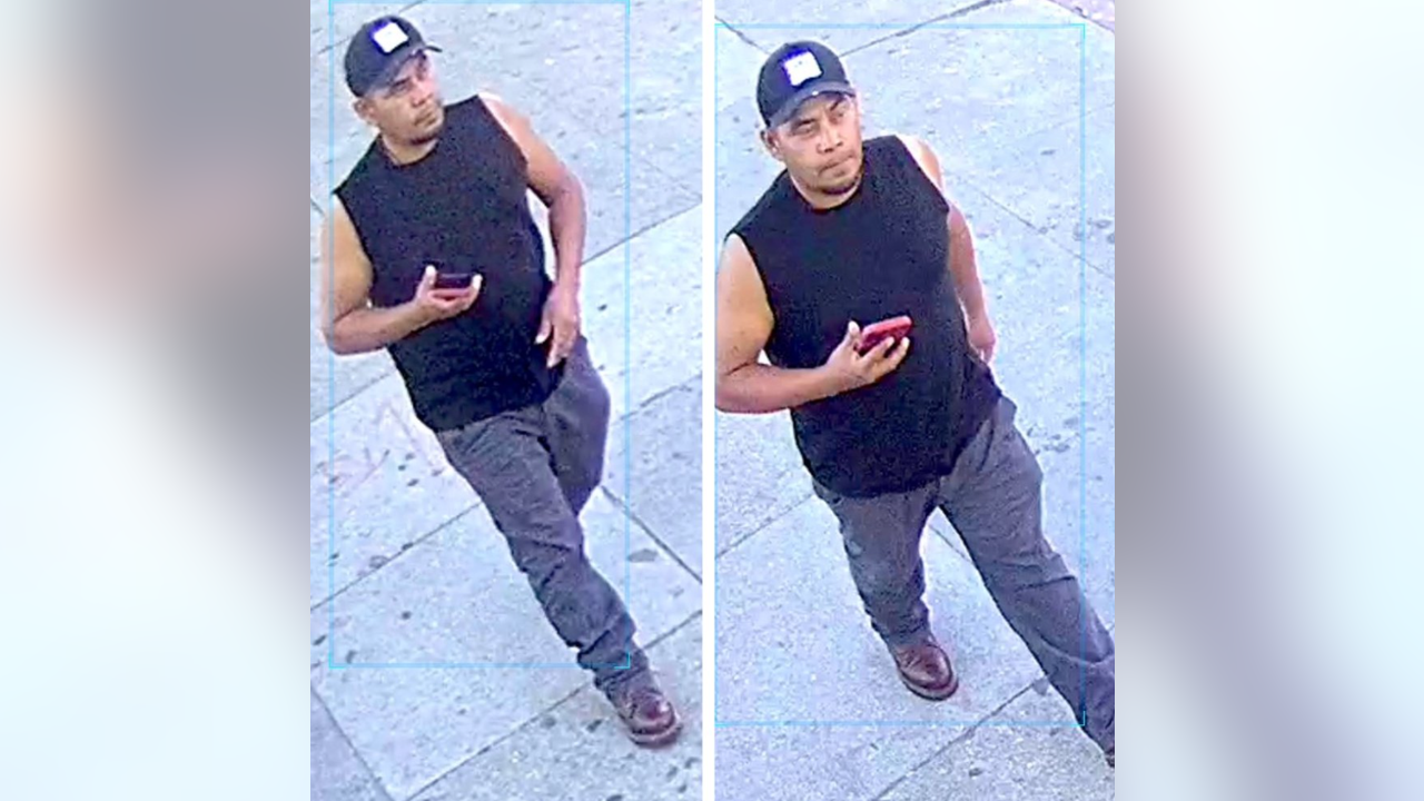 Police released photos of the person of interest walking down the sidewalk. The man in the photo is wearing a navy blue, sleeveless T-shirt, and a baseball cap of the same color. They are wearing brown boots and gray pants.