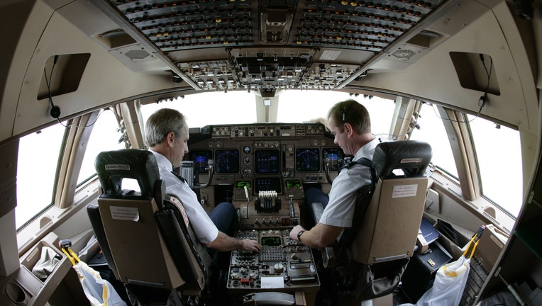 Pilots fly inside the cockpit of a commercial passenger 747-400 airplane.