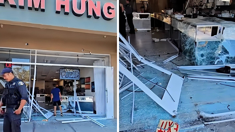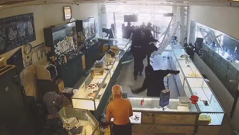 Police said suspects backed a car through the front of the store before "multiple suspects" – at least one of which was armed with a gun – entered, broke display cases, took jewelry and fled in several vehicles.