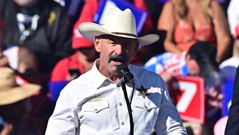 Riverside County Sheriff Chad Bianco addresses supporters of US President and Republican presidential candidate Donald Trump during a rally in Coachella, California on October 12, 2024. (Photo by Frederic J. BROWN / AFP) (Photo by FREDERIC J. BROWN/A