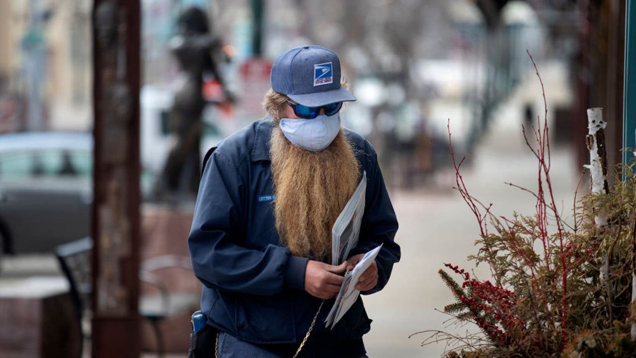 FILE - Don Shea wearing a mask, delivered the mail on Phillips street in downtown Sioux Falls. (Jerry Holt/Star Tribune via Getty Images)