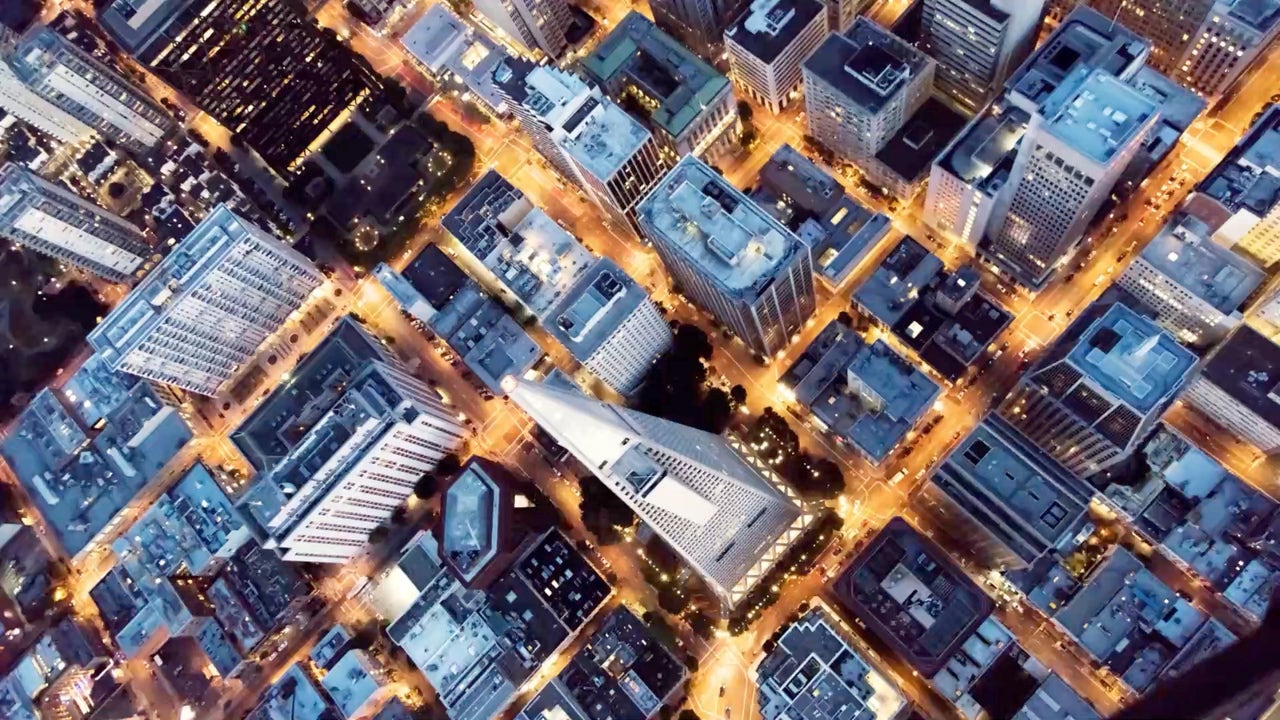File Photo. Overhead aerial of Transamerica pyramid at night, San Francisco, California, USA