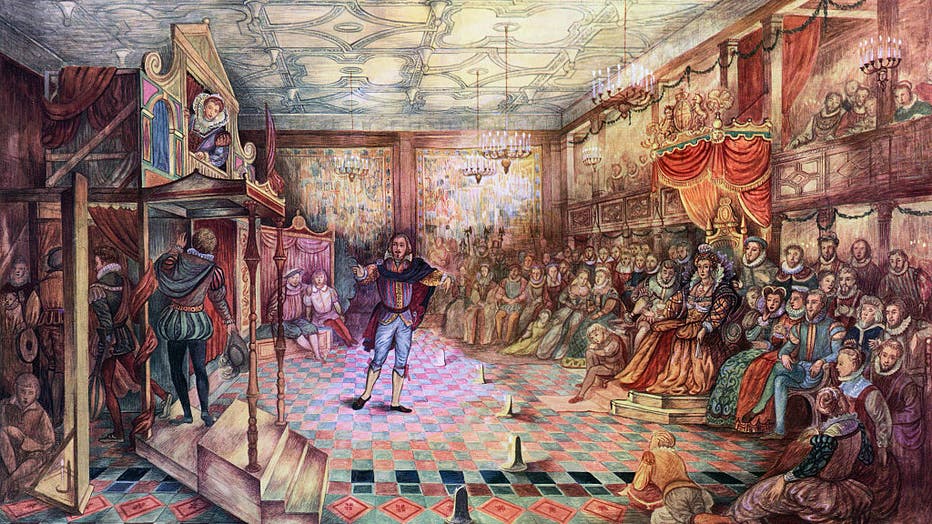 Vintage illustration of William Shakespeare and the Lord Chamberlain's Company performing 'Two Gentlemen of Verona' to Queen Elizabeth I, at Greenwich Palace in 1594; screen print, 1947. (Photo by GraphicaArtis/Getty Images)