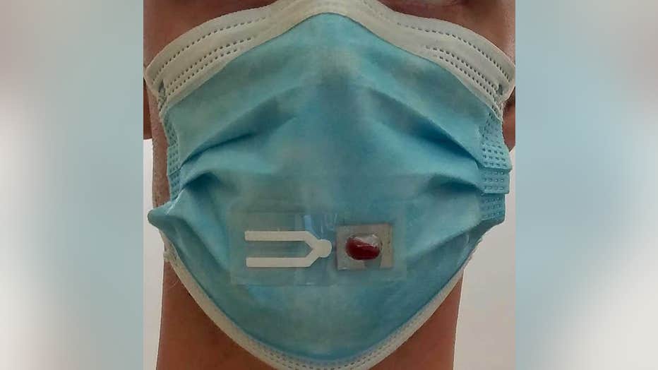 The idea is that as the person breathes through the mask, particles will accumulate on the test strip. At the end of the day or during a face mask change, the person can run the test using a substance that makes the strip change colors.