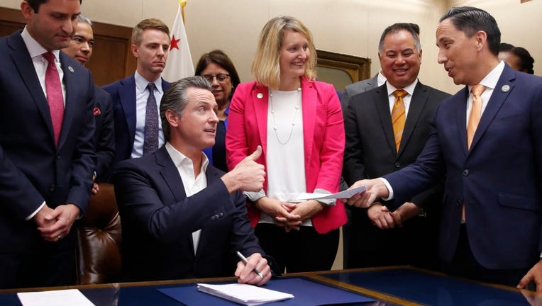 California Gov. Gavin Newsom, seated, gives a thumbs up to Assemblyman Todd Gloria, D-San Diego, right, after signing Gloria's measure that prohibits the sale of firearms and ammunition at the Del Mar Fairgrounds, during a ceremony the Capitol in Sac